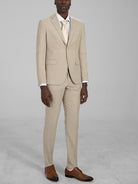 The waist of our pants can be let out up to 1 1/2" or taken in up to 3" by a tailor, who can also taper in the suit and hem the pants to your desired length.